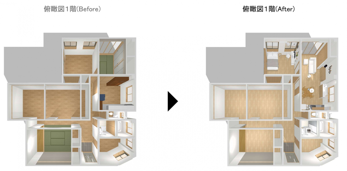 細かく区切られた昔ながらの間取りを見直し、現代的な間取りへ。